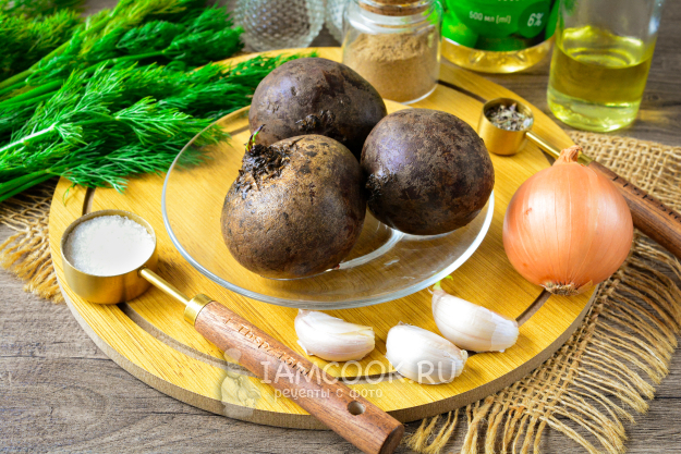 Соберите все ингредиенты для приготовления тушеной свеклы с луком и чесноком.