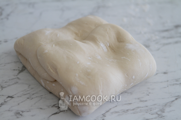 Через час достаньте тесто, уложите его перед собой так, как на фото, и начните раскатывать тесто снова в прямоугольник. Затем сложите его аналогичным способом и уберите в холодильник на час.