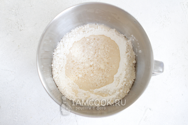 Далее тесто можно замесить вручную или в планетарном миксере. В миксере, конечно же, удобнее. В муку влейте всю жидкость.