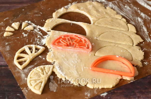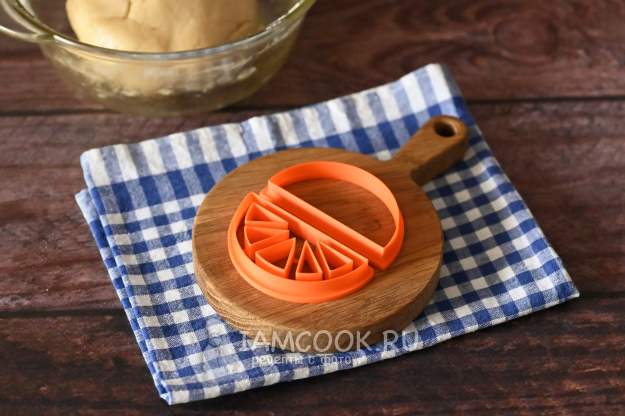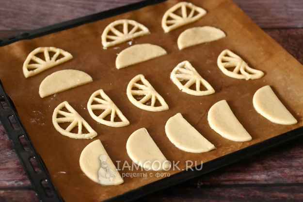Слегка припылите поверхность мукой и раскатайте тесто в пласт около 0,5 см. Вырежьте равное количество печенек в виде полукруга и в виде апельсиновой дольки.