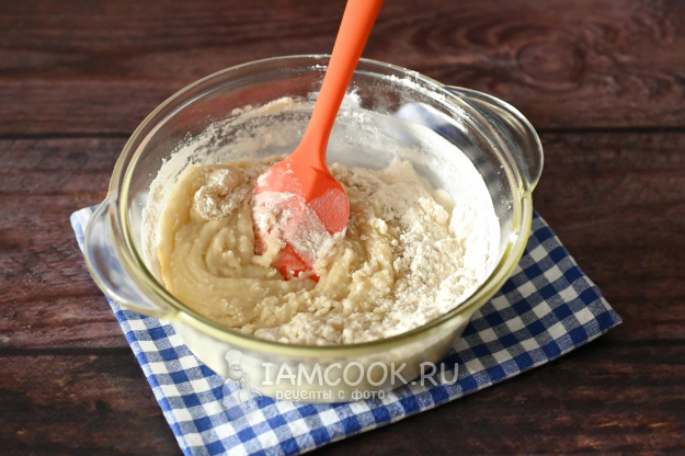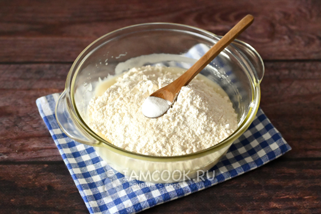 Всыпьте чуть больше половины указанного количества муки и добавьте разрыхлитель.