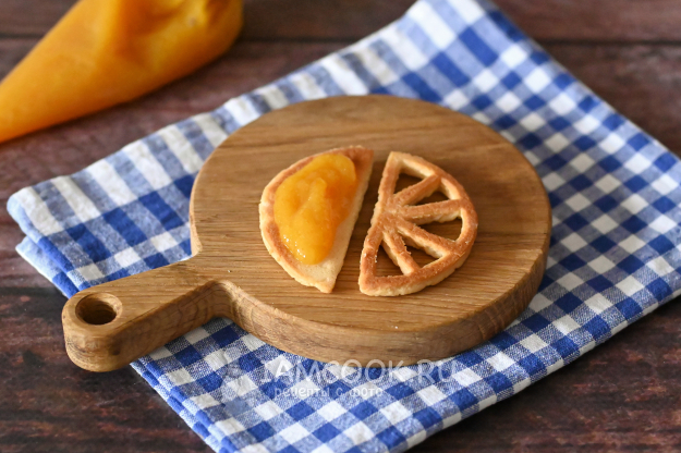Чтобы собрать печеньку, нужны две заготовки: полукруг и апельсиновая долька. На нижнюю часть (полукруг) нанесите апельсиновый джем. Мне удобно было это делать из кондитерского мешка.
