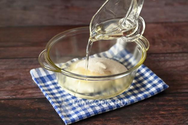 В миску положите сметану, добавьте сахар, соль и влейте растительное масло.