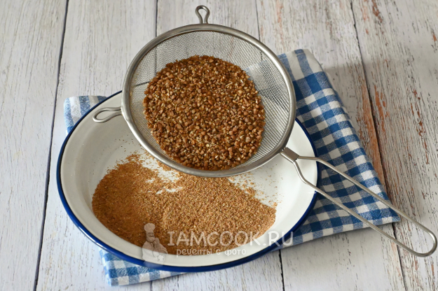 Затем откиньте всё, что смололи, на сито и потрясите над тарелкой. В тарелке останется очень мелкая фракция, похожая на манку, она нам в каше не нужна. Эту гречневую "манку" можно использовать в выпечке или для панировки. А вот то, что останется на сите - как раз и есть гречневая сечка. Её и будем использовать для приготовления каши. Отмеряем гречку по весу уже в молотом виде.