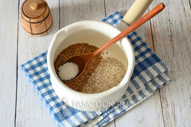 Оба вида крупы отправьте в кастрюлю, добавьте по вкусу соль.