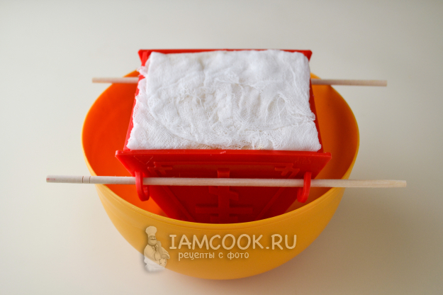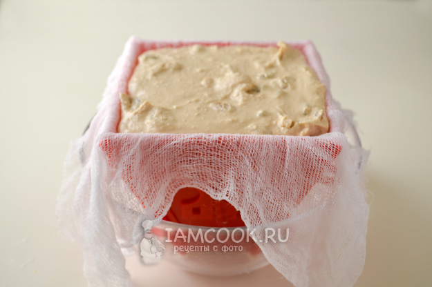 Марлю сложите в два слоя, смочите водой, отожмите и застелите в специальную форму для творожной пасхи.