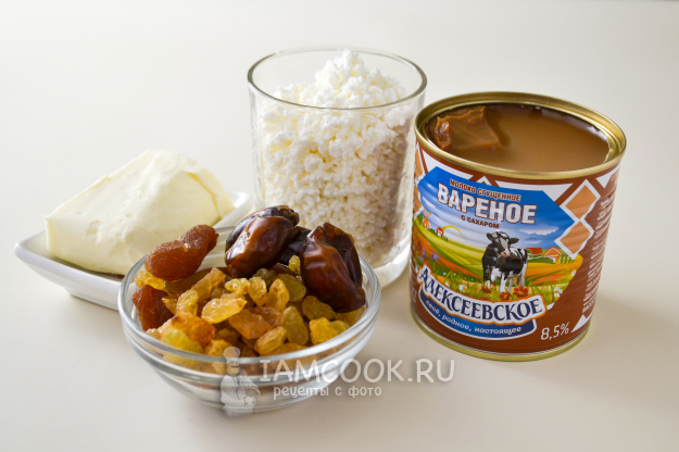 Продукты для приготовления карамельной творожной пасхи с сухофруктами соберите по списку.