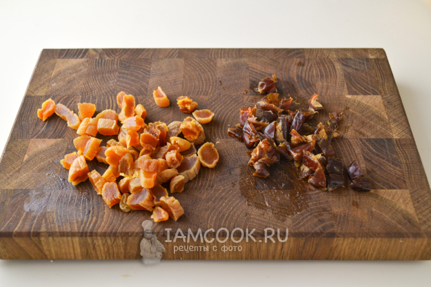 Из фиников удалите косточки. Сухофрукты обсушите на бумажном полотенце, и нарежьте мелкими кусочками финики и курагу.