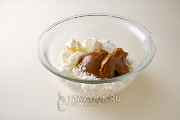 В миску положите творог, мягкое сливочное масло и вареное сгущенное молоко.