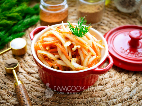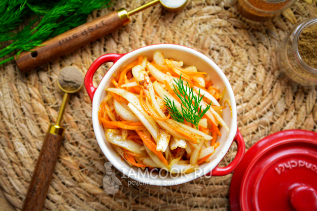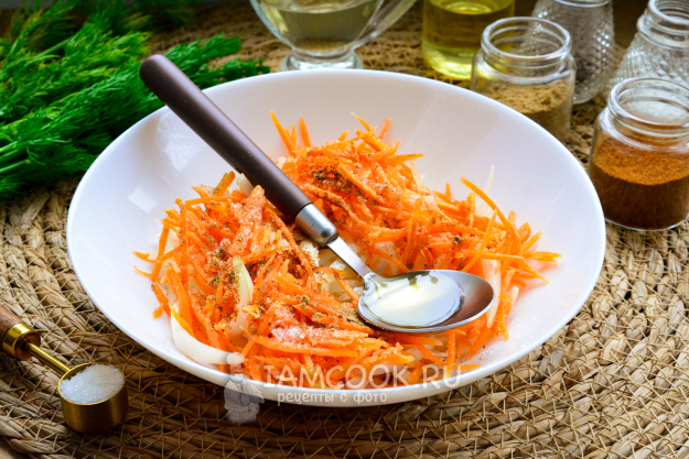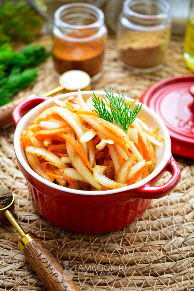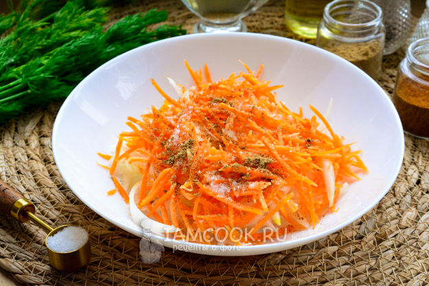 Перемешайте все ингредиенты, отправьте лук с морковью и специями в холодильник на 30-40 минут. Овощи как следует промаринуются.