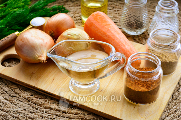 Соберите все необходимые продукты для приготовления маринованного лука с морковкой.