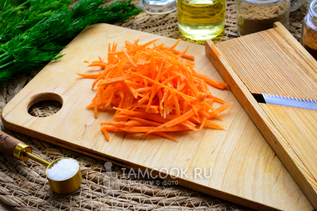 Морковь натрите на терке, лучше взять для этого корейскую терку - с ней получится тонкая и красивая стружка моркови.