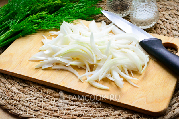 Почищенный репчатый лук измельчите, нарежьте тонкими или средними полукольцами.