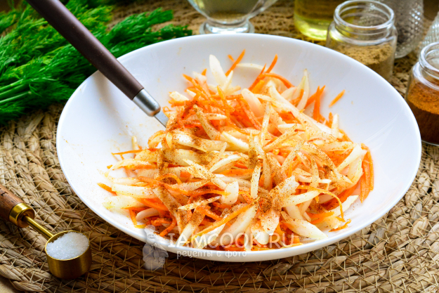 В глубокой тарелке смешайте лук с морковью. Всыпьте соль по вкусу, добавьте сахар, черный перец, молотый кориандр и сладкую паприку. Все эти специи придадут закуске чудесный аромат.