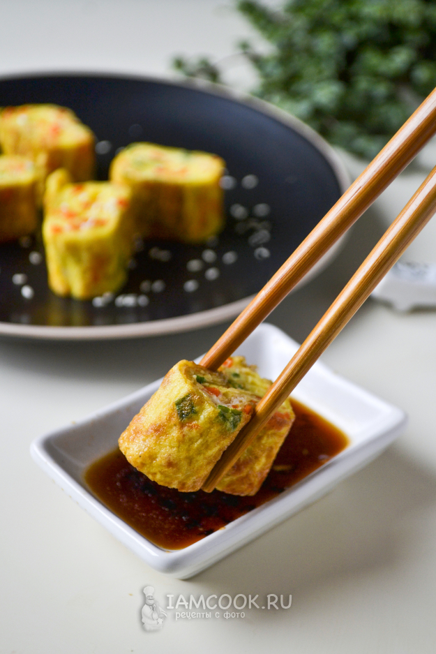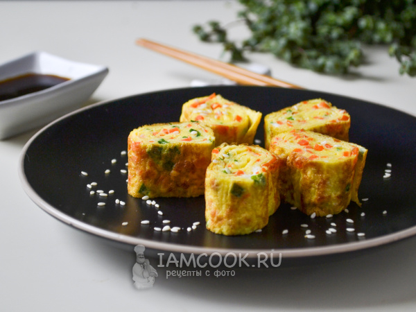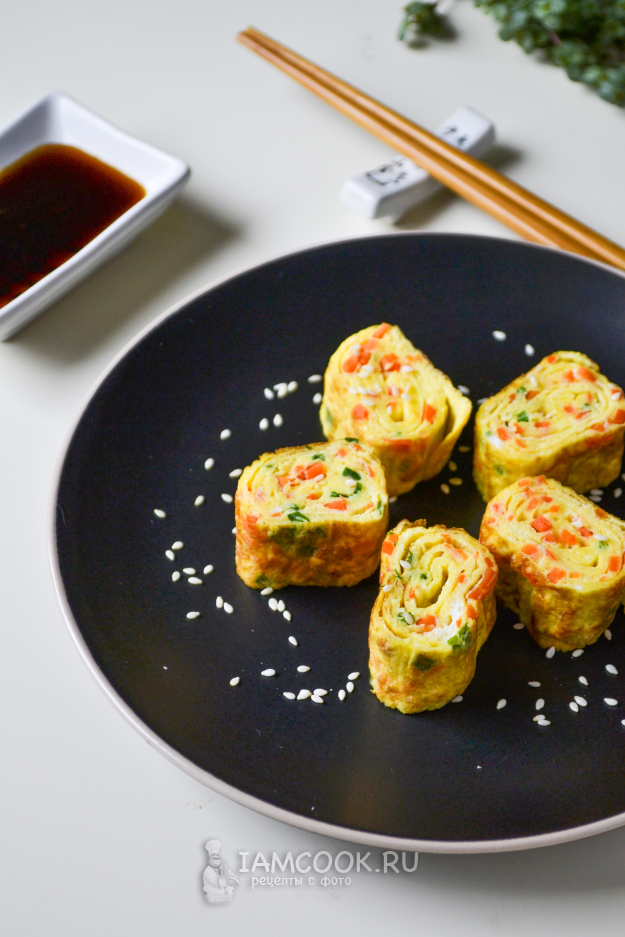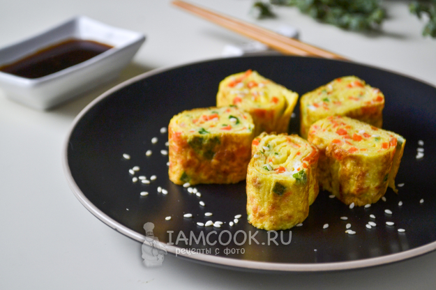 Подавать корейский омлет Керан мари традиционно с соусом, посыпав семенами кунжута. Будет вкусно как с соевым соусом, так и с томатным.