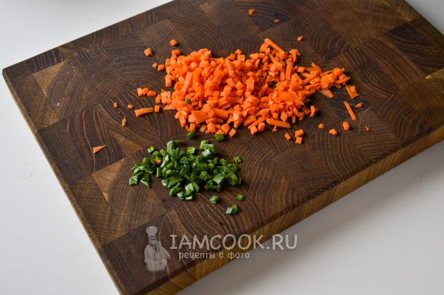 Морковь нарежьте мелким-мелким кубиком, зеленый лук тоже нарежьте.