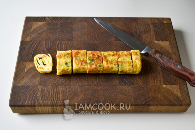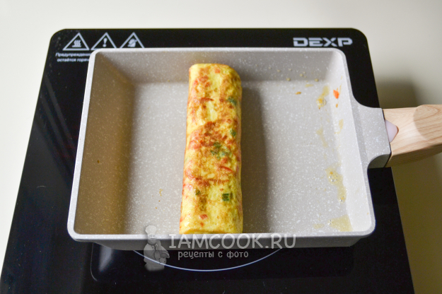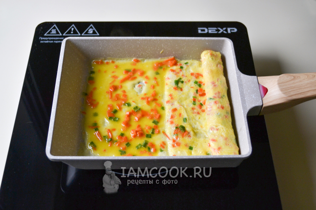 На освободившееся место влейте яичную смесь. И таким же способом, когда низ схватится, начните сворачивать омлет в рулет. Не нужно дожидаться полной прожарки омлета.