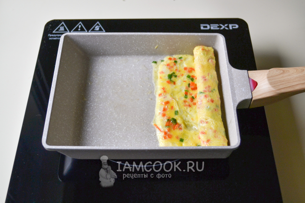 Сверните омлет, оставив небольшой участок не свернутым. Сдвиньте на край сковороды.