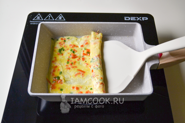 Как только нижняя сторона омлета начнет схватываться, аккуратно начните сворачивать омлет в рулет.