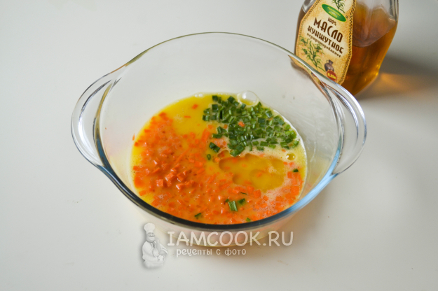 В миску с яйцами всыпьте лук и морковь, влейте кунжутное масло. Перемешайте.