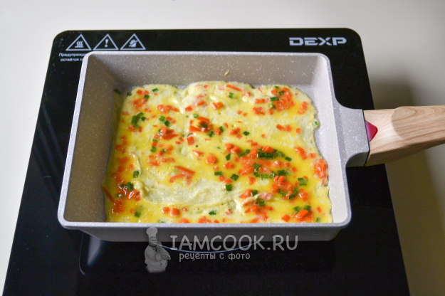 Сковороду разогрейте с минимальным количеством масла. Влейте порцию яичной смеси тонким слоем. Установите температуру ниже средней.
