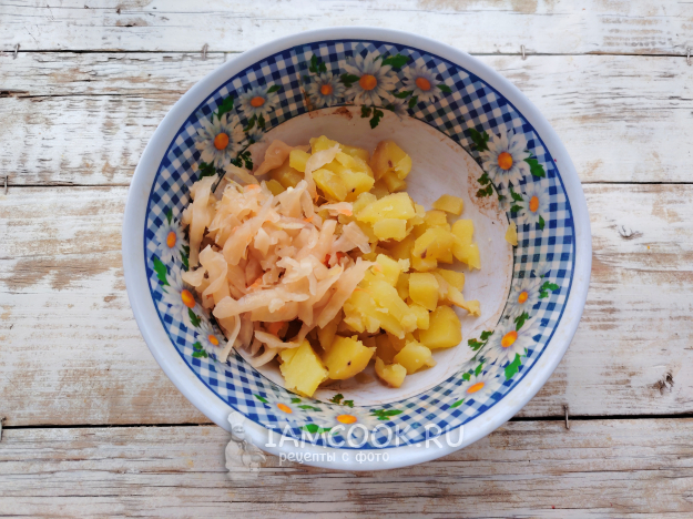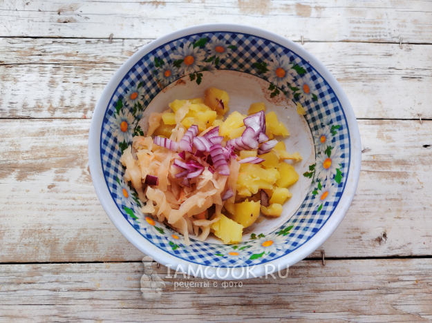Добавить к картофелю квашеную капусту и мелко нарубленную луковицу.