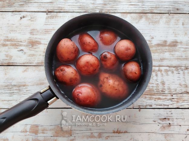 Картофель вымыть, отварить в мундире до готовности. Варить овощ следует около 25 минут.