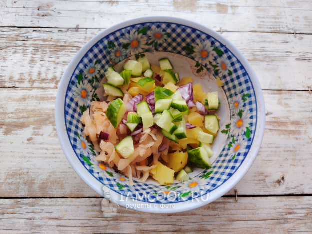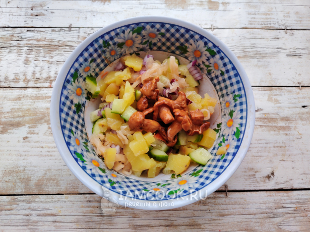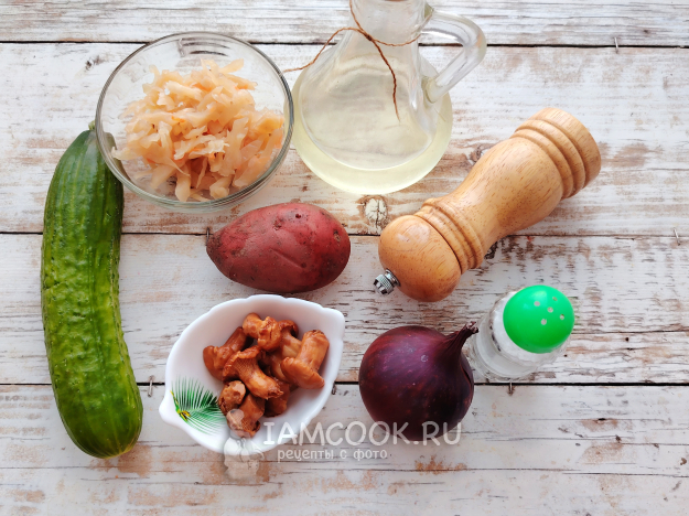 Собрать по списку продукты для салата с маринованными грибами и картошкой.