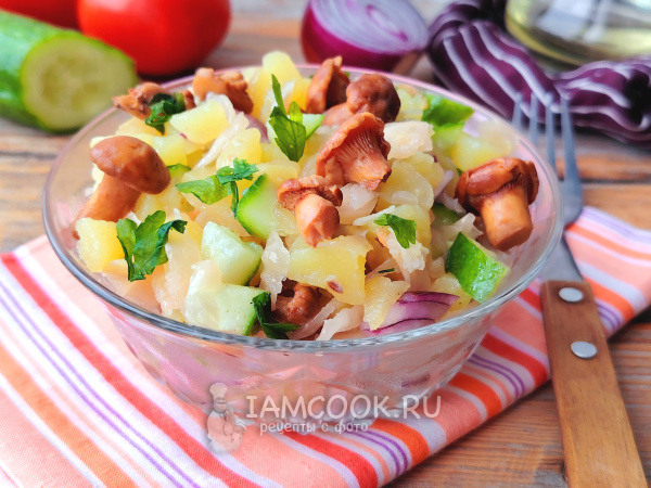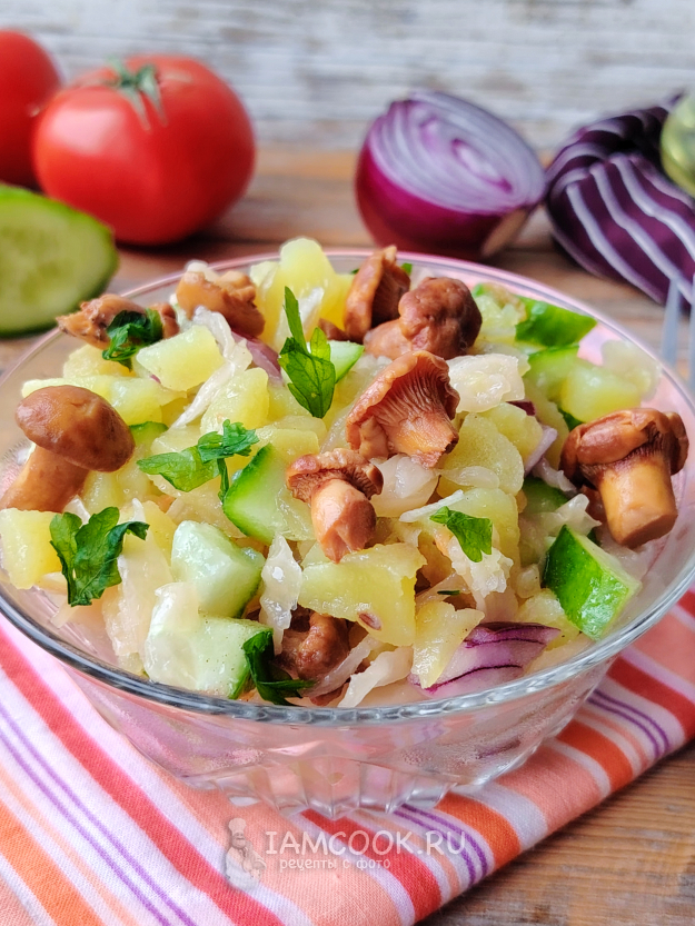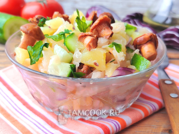 Готовый салат с маринованными грибами и картошкой подать к столу. Он вкусен как в теплом виде, так и охлажденным. Приятного аппетита!