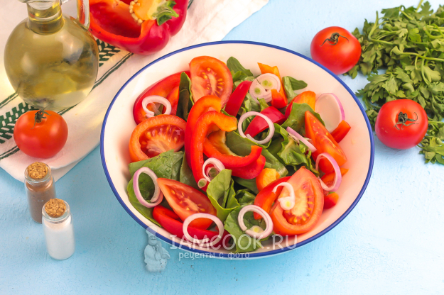 Можно добавить кольца красного лука, помидоры, соль и перец - по желанию. Сбрызните салат копченым растительным маслом.