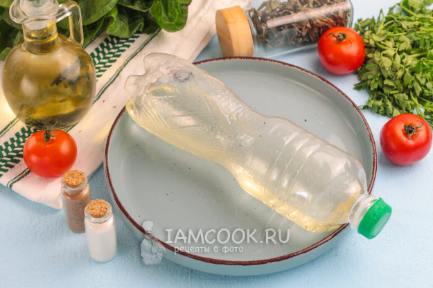 Снимите шапочку из фольги и аккуратно влейте в емкость растительное масло через горлышко, слегка наклоняя бутылку. Наклонять обязательно, чтобы масло не вылилось через отверстие снизу. Закройте емкость крышкой и оставьте на 5 минут.