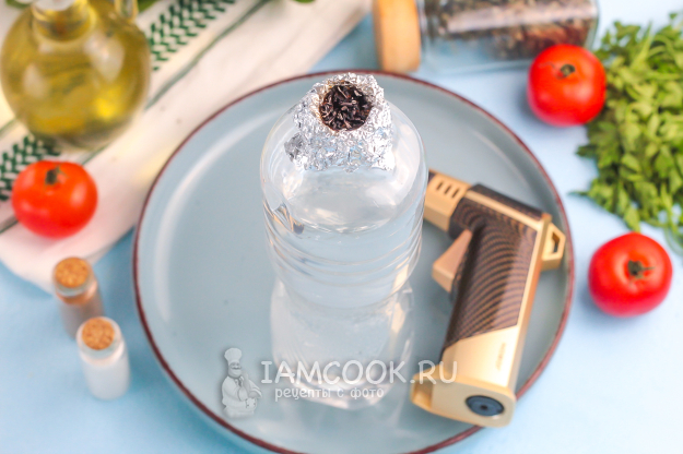 Накройте бутылку шапочкой из фольги и выложите в нее сушеные травы: розмарин, орегано, чабрец, тимьян или мяту. Свежие не подойдут. С помощью горелки или зажигалки подожгите их - в этом моменте лучше стоять над раковиной. Пробейте ножом аккуратно бутылку в нарисованном кружочке и выпустите воду. Сразу же подожгите травы снова - по мере выливания воды из бутылки она будет наполняться дымом.