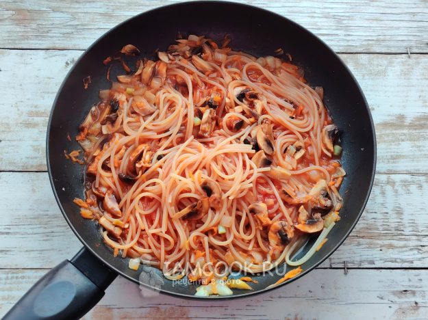 Переложить вместе с отваром спагетти в сковороду.