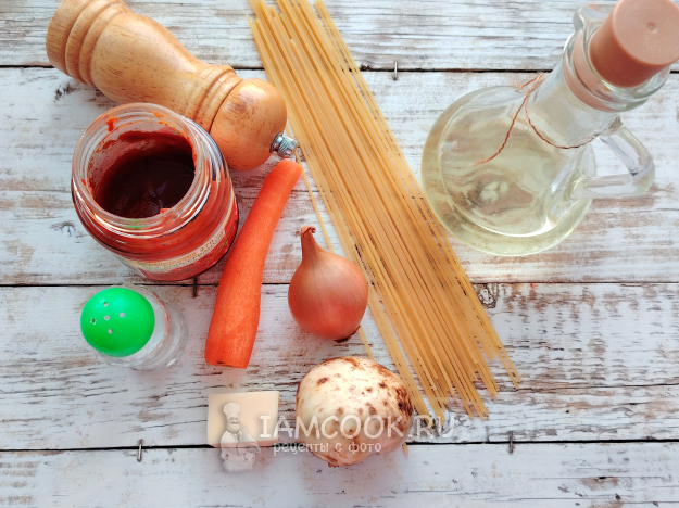 Соберите по списку продукты для приготовления пасты с томатной пастой и грибами.