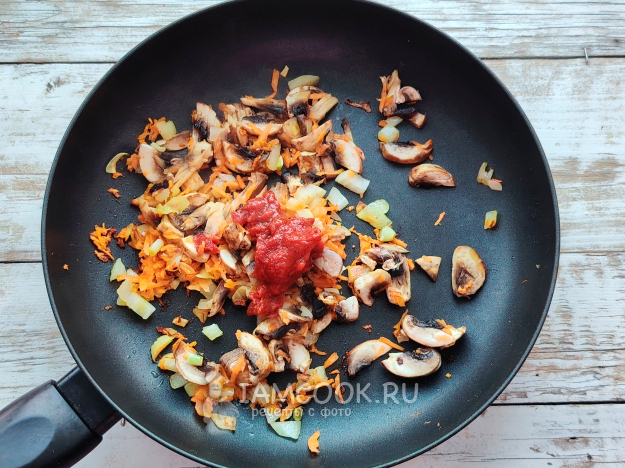 Добавить к овощной зажарке томатную пасту, перемешать.