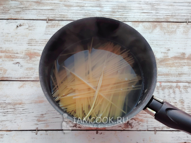 Отварить спагетти до состояния аль-денте. Как правило, на варку требуется около 8 минут.