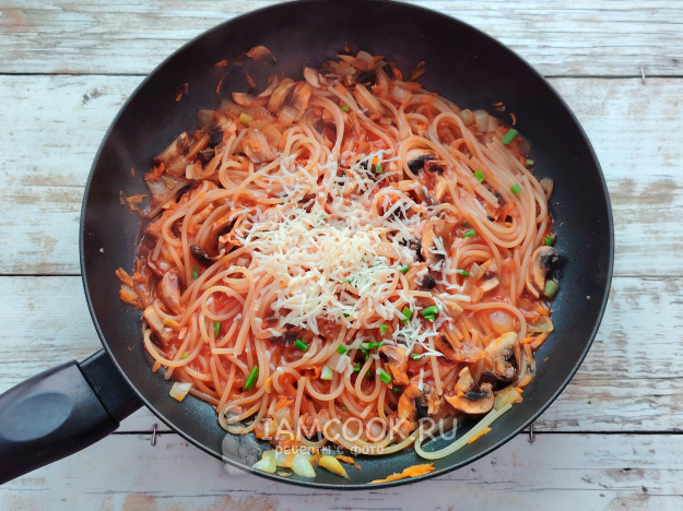 Продолжить тушить, пока жидкость полностью не выпарится, но пересушивать макароны не следует. Посыпать готовое блюдо тертым сыром и мелко рубленным зеленым луком.