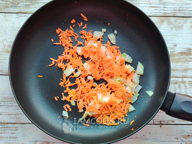 Репчатый лук почистить, мелко порубить ножом, морковь натереть на терке. Овощи отправить на разогретое на сковороде масло. Обжарить овощи для мягкости.