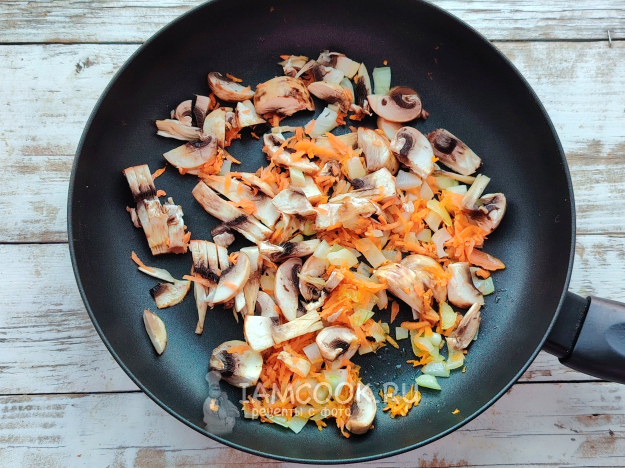 К овощам отправить в сковороду нарезанный на кусочки грибы. Жарить на среднем огне, периодически помешивая, около 5-7 минут.