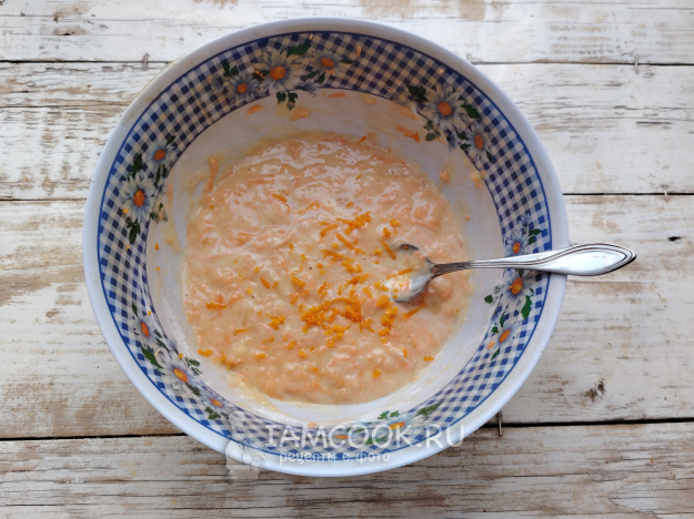Перемешать тесто, оно должно получиться по консистенции как густая сметана. Добавить цедру, перемешать.