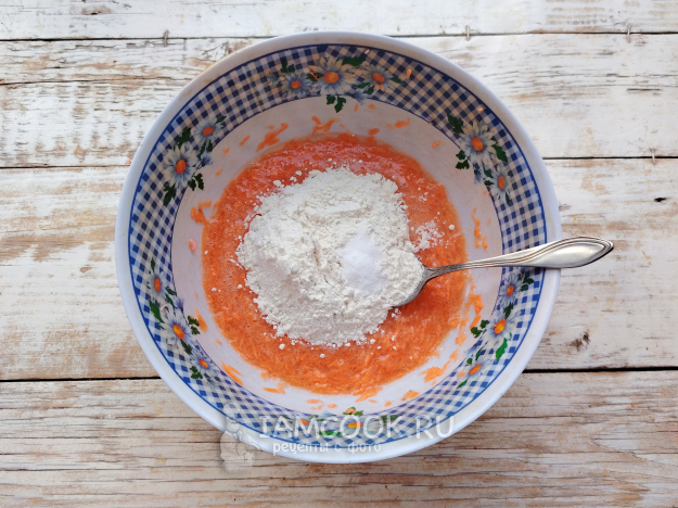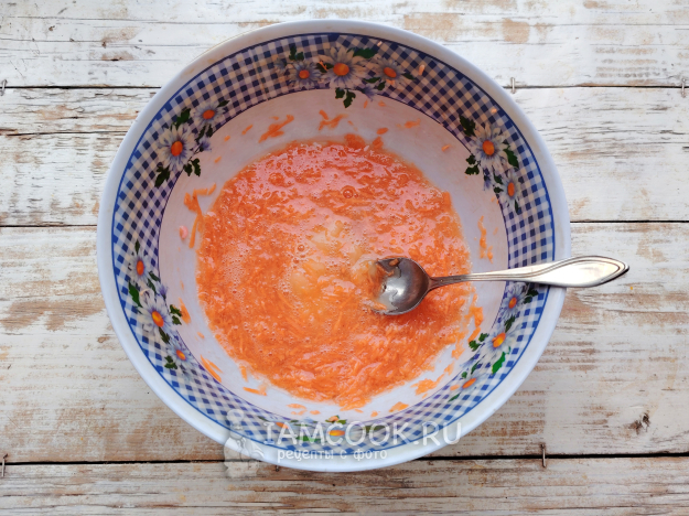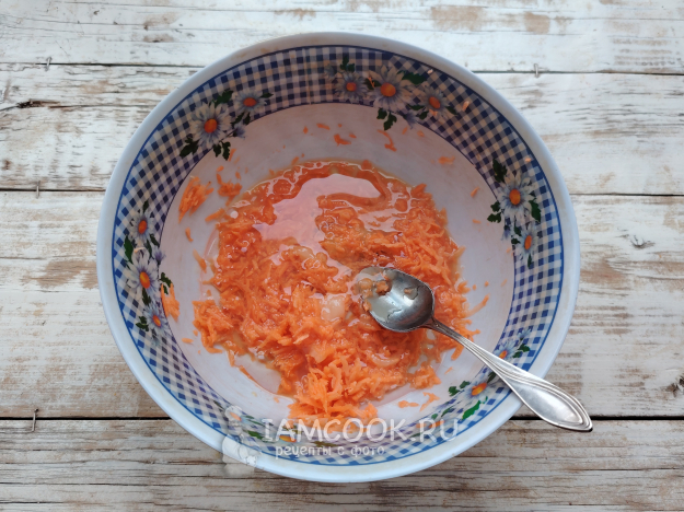 Добавить натертую на мелкой терке морковь. Влить масло.