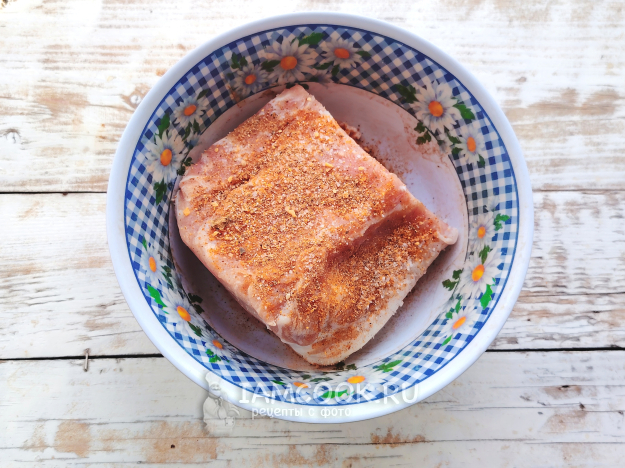 Мясо промыть и вымочить в холодной воде, оставив кусок на час в ней. Воду слить, мясо просушить. Намазать мясо маслом и натереть смесью перцев, паприкой и солью, оставив на 15 минут при комнатной температуре.