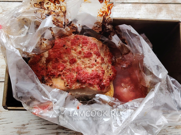 Затем пакет раскрыть и дать мясу подрумяниться, отправив его в духовку еще на 20 минут.