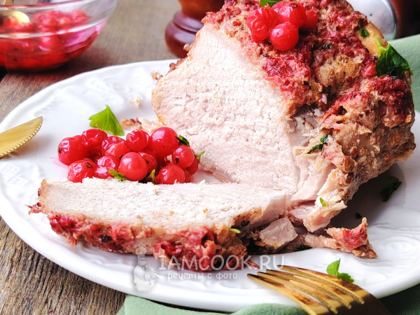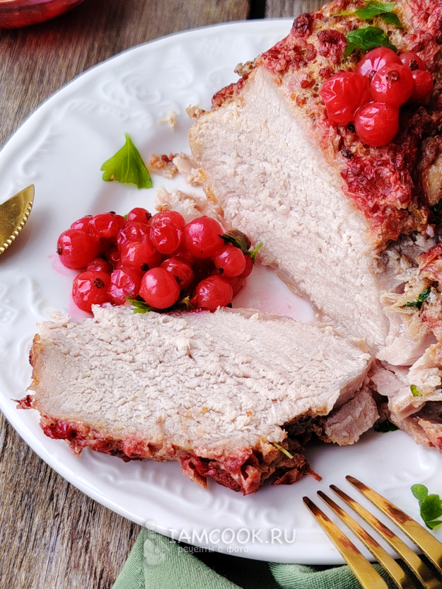 Запекать мясо в духовом шкафу в закрытом пакете, сделать в пленке несколько проколов ножом, чтобы выходил горячий пар, запекать свинину с красной смородиной в течение 40 минут.