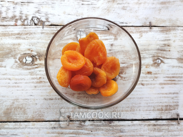 Курагу промыть, залить горячей водой, оставить на 15 минут, чтобы она набухла и стала мягкой. Воду слить.