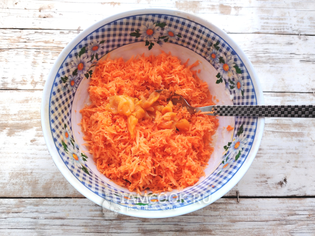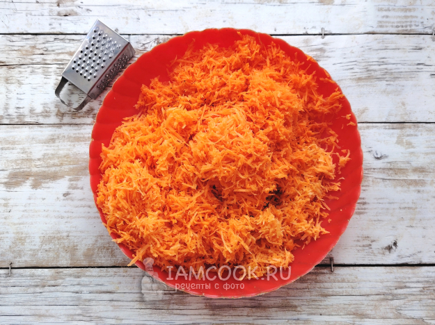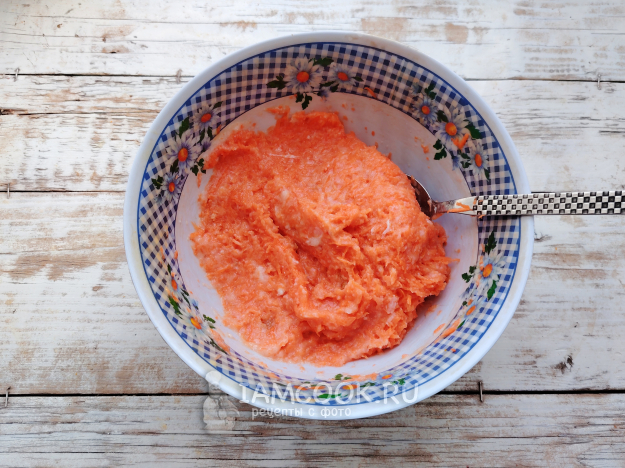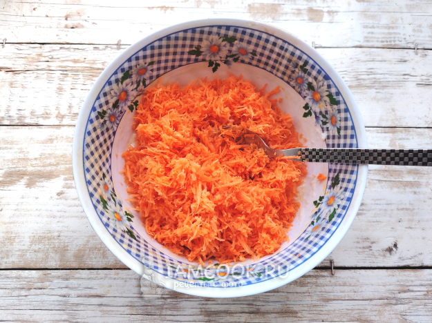 Морковь почистить, натереть на терке с мелкой ячейкой. Если овощ слишком сочный, сок можно слегка отжать.