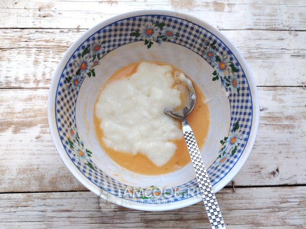 В яичную смесь переложить слегка остывшую манную кашу. Перемешать.