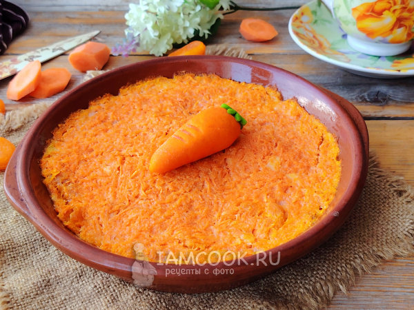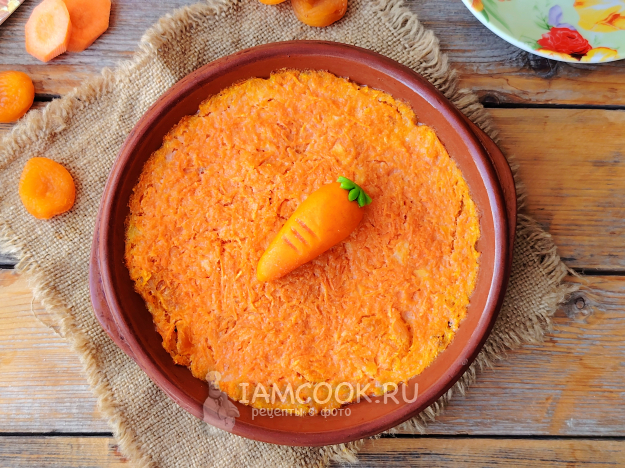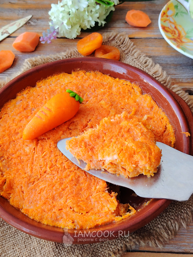 Подать морковную запеканку с курагой к столу, украсив ее, например, морковкой из марципана, шоколадом или по своему усмотрению. Приятного аппетита!