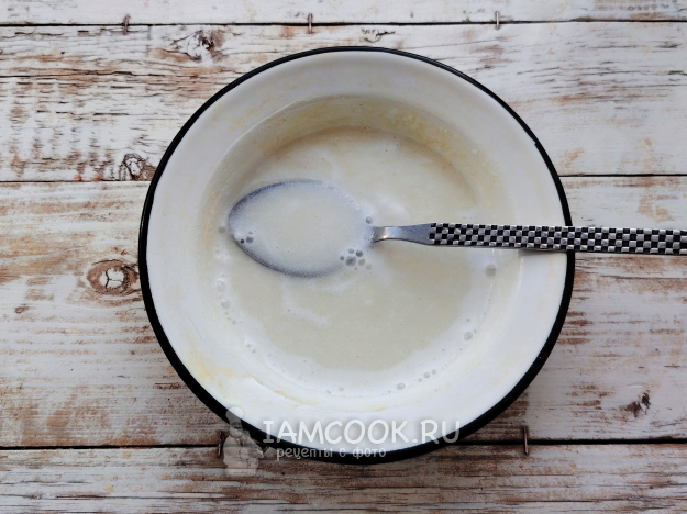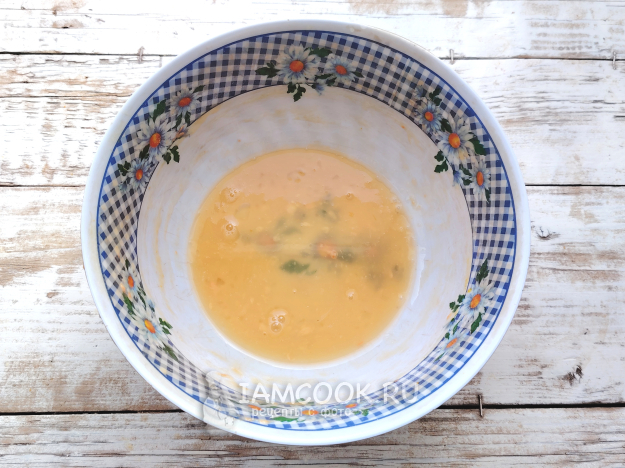 Яйца вбить в глубокую посуду, венчиком взбить смесь до однородности.