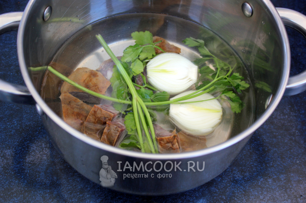Время варки сухой колбасы и, соответственно, бульона из неё может варьироваться, и обычно не меньше часа, а может и дольше. Для ускорения можно колбасу нарезать или порубить (такие случаи бывали) порционными кусками. В воду добавляют очищенную луковицу, стебли свежих трав, сухие травы. Солить бульон не спешите, колбаса обычно солёная, так что соль может и вообще не понадобиться. Куски колбасы из бульона нужно извлечь, бульон при необходимости процеживают. Часть бульона отлейте для подачи к хинкалу.